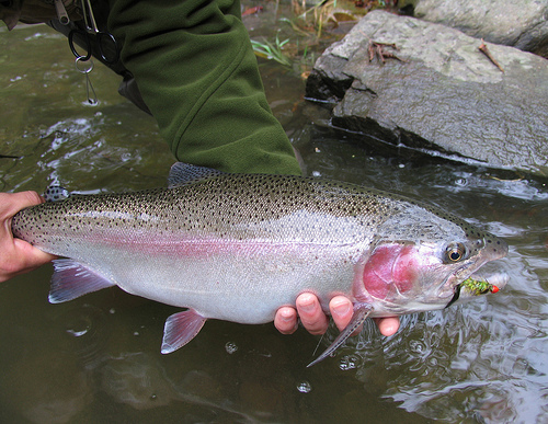 This springtime rainbow was holding in deep water below a highway bridge in western Massachusetts.
