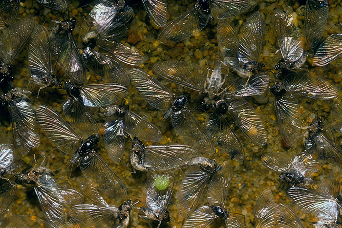 Long after the Trico hatch has ended and the sun has set, the white fly nymphs crawl out of their niches and prepare to hatch. Just before dark, the heavily gilled white fly nymphs wiggle to the surface where they immediately hatch into duns. After completing the molting process, the mating begins. From this point, it’s business as usual: the males fall to the water and expire, while the females descend to the water and deposit their eggs. When egg laying is completed, the females drop to the water. Emergence, mating and egg laying happen in a two-to-three hour period.