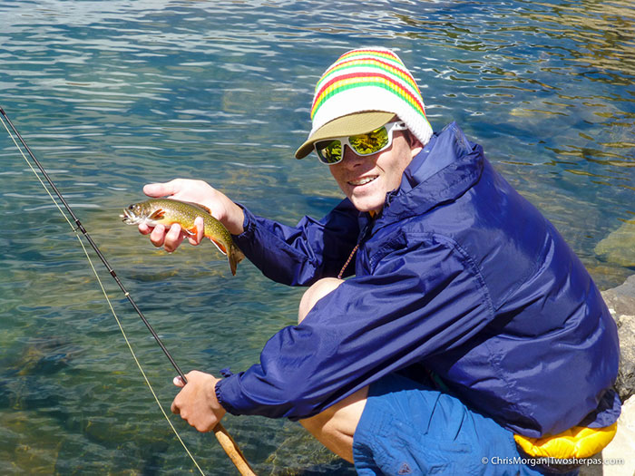 Amethyst Lake looks like a piece of tropical water lost in the mountains. Our arms were tired by the time we’d made our way around to the far side of the lake, so we agreed to take a break. Finn napped like a lizard on a large rock outcropping, Lucy rooted around for an especially vocal pika, and I wandered around taking photos. None of the fish we caught were over twelve inches long, but their bright colors and enthusiasm had been awe-inspiring to both of us. People can swoon over all sorts of different fish, but for me there are very few fish that match the beauty of a perfectly formed brook trout in early spawning colors. After Finn’s nap, we caught a few more fish as we finished our loop of the lake, but we were both ready to get back to camp for an early dinner. We couldn’t believe the day we’d just had. Finn and I had caught and released 135 and 120 fish, respectively. I’d never caught so many fish in one day in my life, and neither had he.