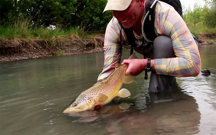 After 5 hours of walking up an increasingly murky side channel to a larger river that was being impacted by heavy rains in the high country, we finally came to the mouth of a spring creek tributary unaffected by rains. And cue the rising brown trout spotted in the sliver of gin-clear water. We watched a spell as the fish cycled round the clear water pocket, making moves that respected the brown’s movement, its visibility, and the sensitivity to its small, quiet habitat. Note the time we take in filming this sequence, how subtle the movements are, how deliberate each move is made, when the casts are made. The first cast was taken and the hook set was ok, but note how the head turns quickly toward the angler and the pull of the line sees the hook come straight out from the fish. No matter, with low angling pressure at this location it remained on feed, cycling and rising. Next cycle around the clear water another cast, another take.